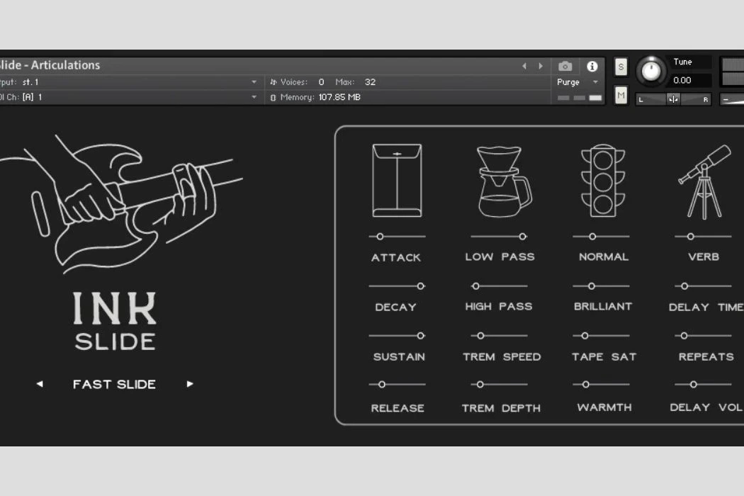 Compatible macOS et Windows, Ink Slide inclut aussi un algorithme de réverb à réponses d’impulsions pour placer la guitare dans des espaces acoustiques riches. Les contrôles d’enveloppe, filtre et drive permettent d’affiner le grain : du murmure intime à la texture un peu rugueuse qui accroche le mix sans le saturer.