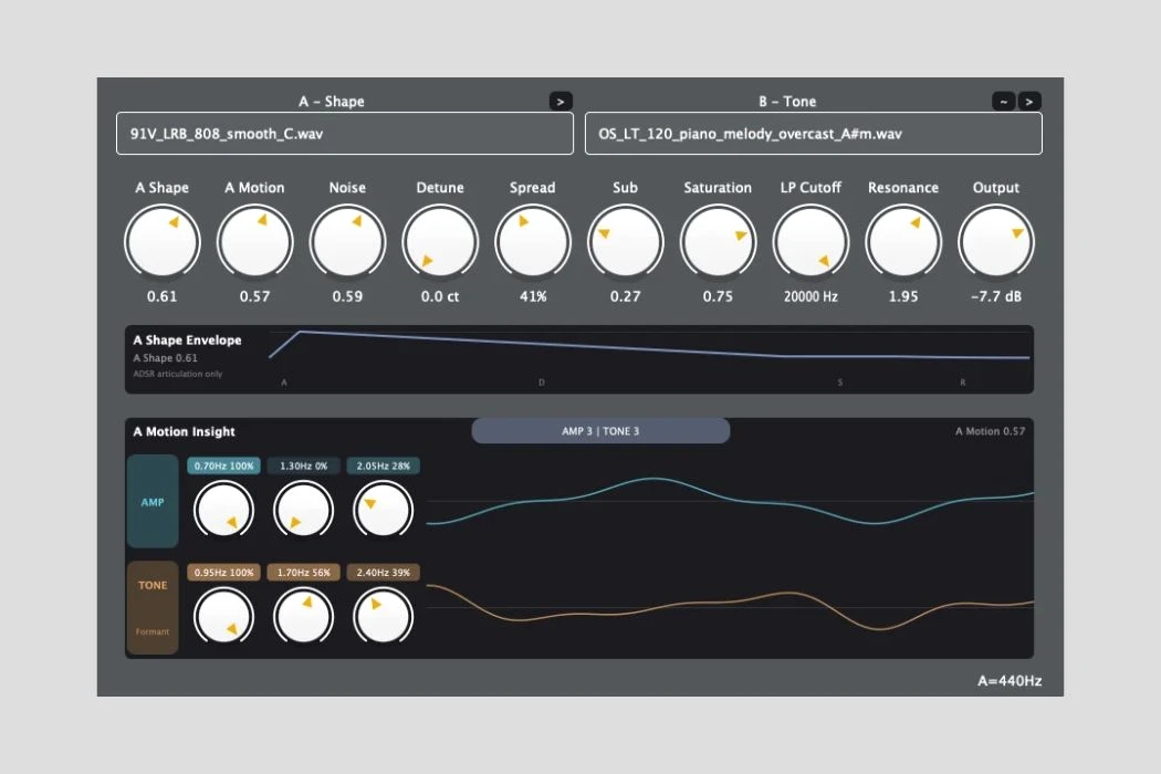 Il utilise deux fichiers audio, A (Shape) et B (Tone), pour créer une nouvelle voix de synthé. Le son A fournit mouvement, articulation et rythme, tandis que le son B détermine la couleur et la substance sonore.